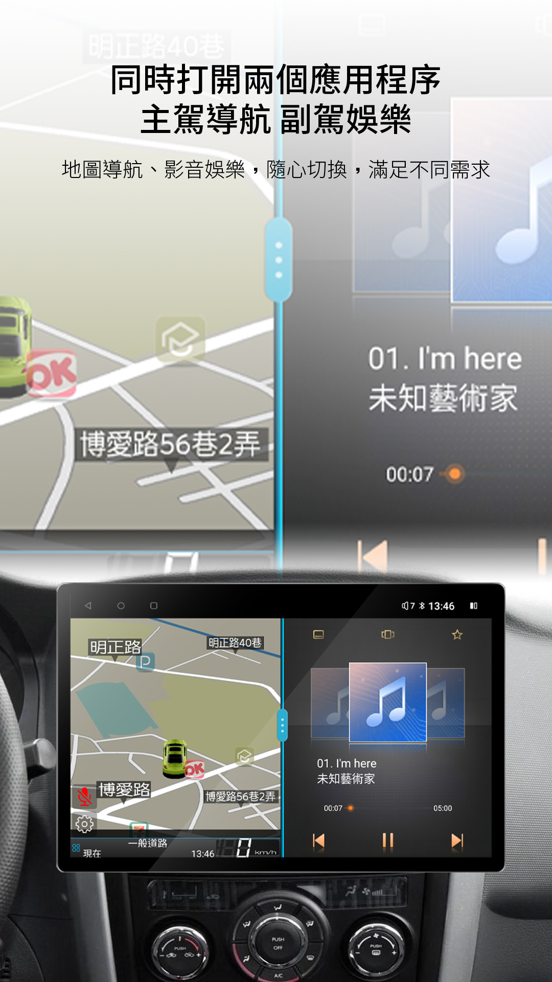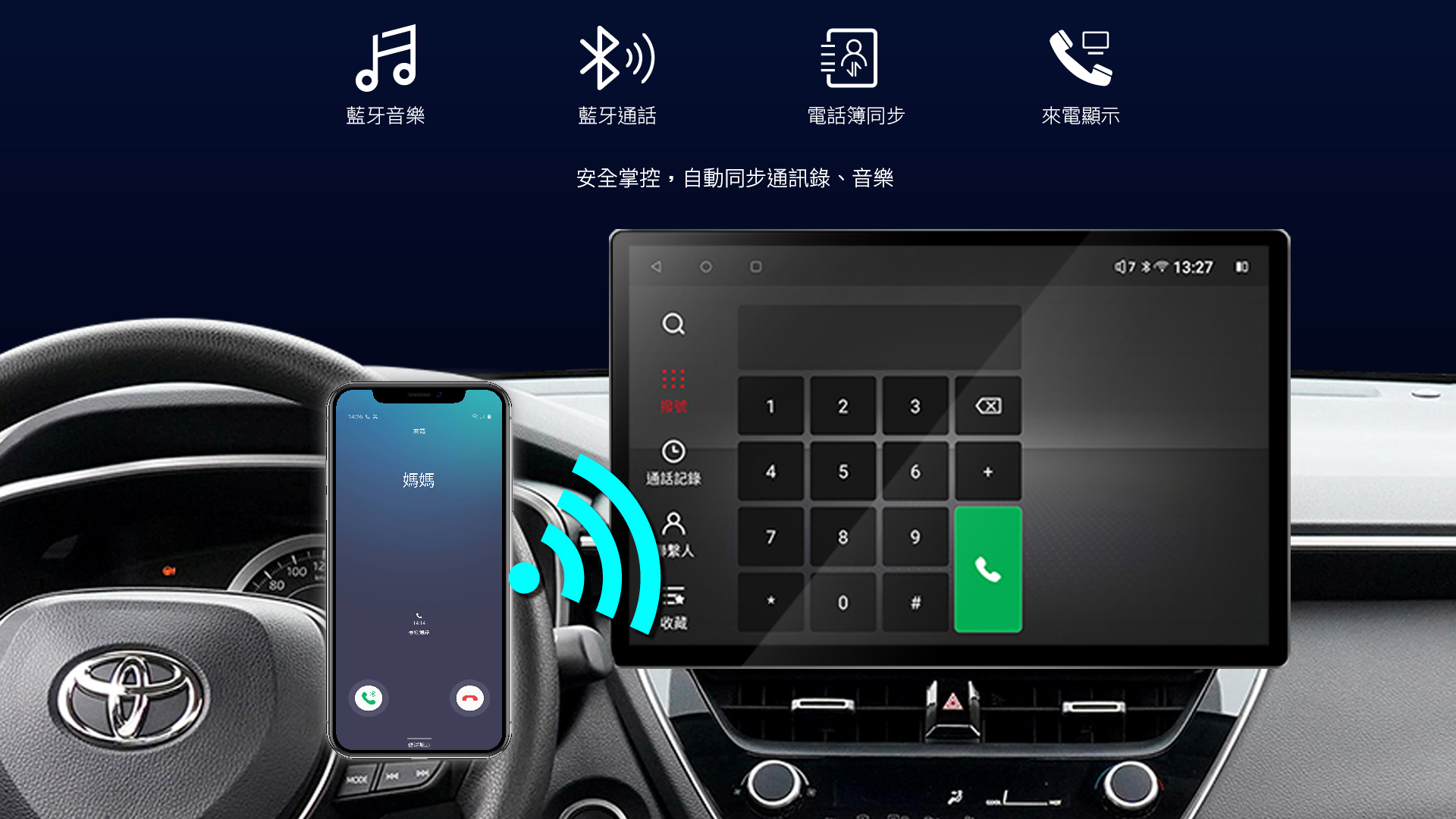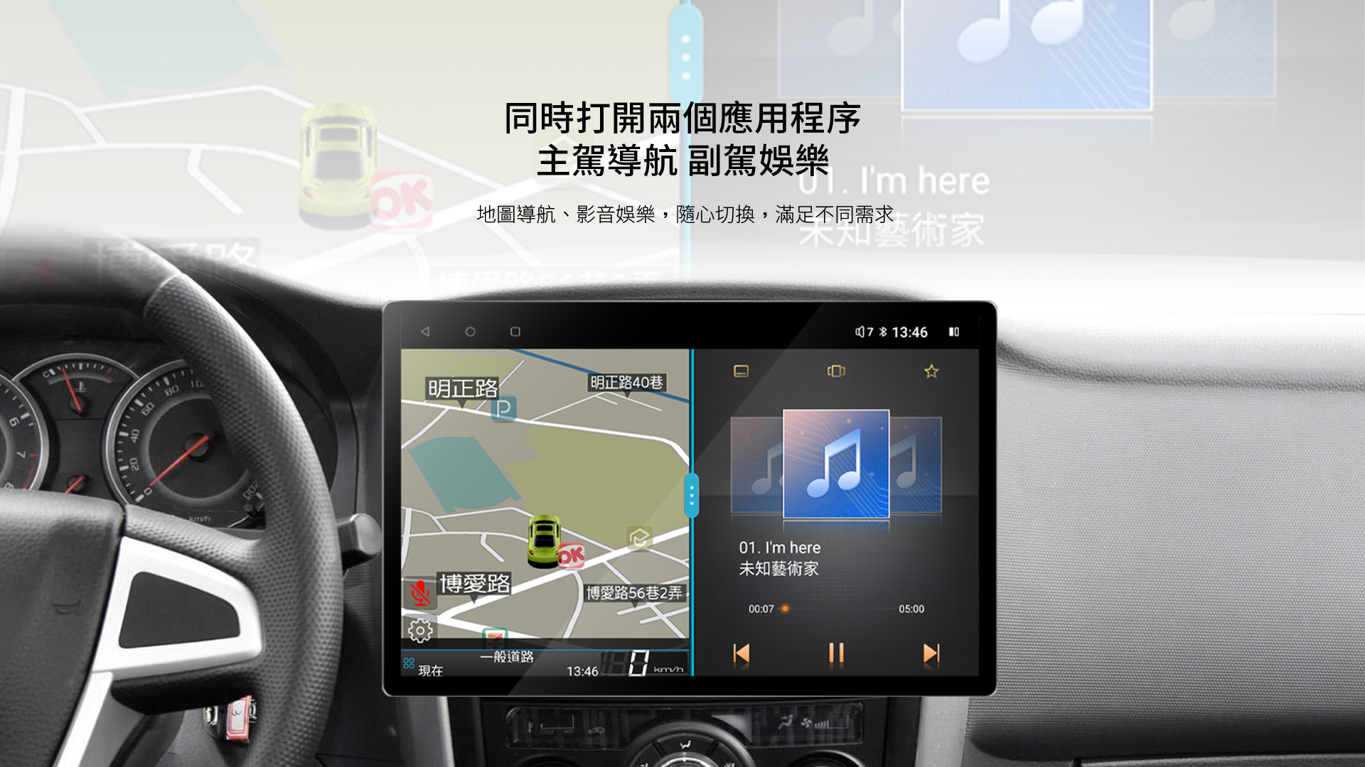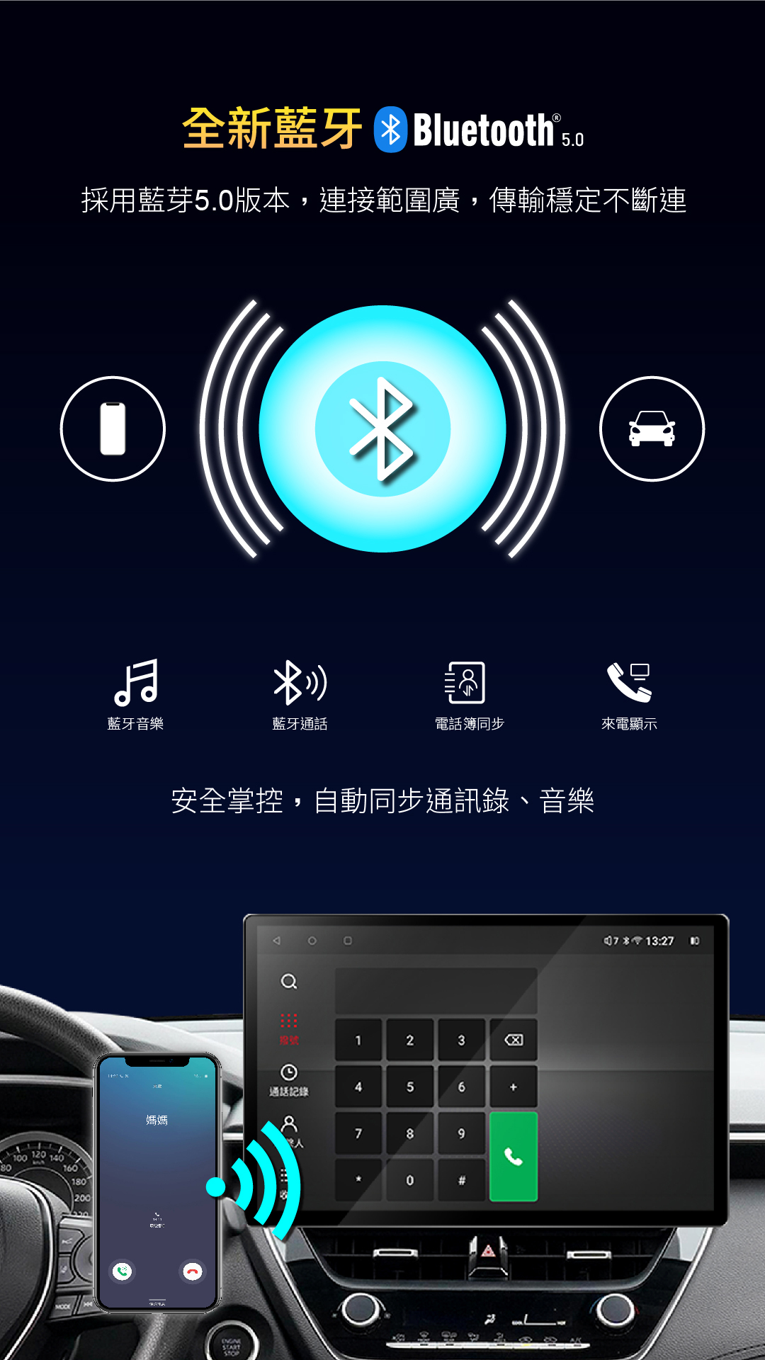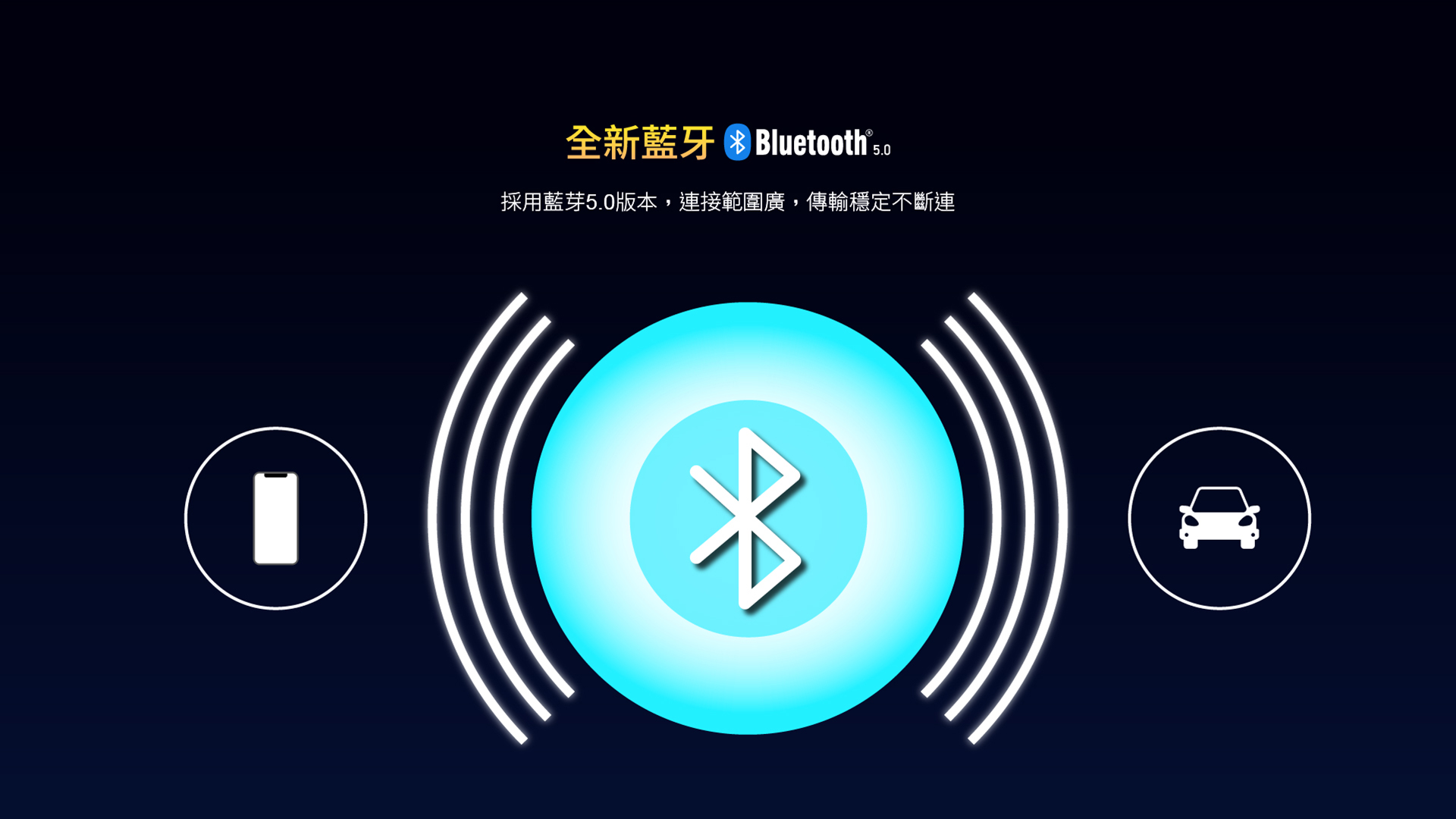 • 內建:Bluetooth 5.0 支援行動電話免持/藍牙音樂分享/電話簿同步